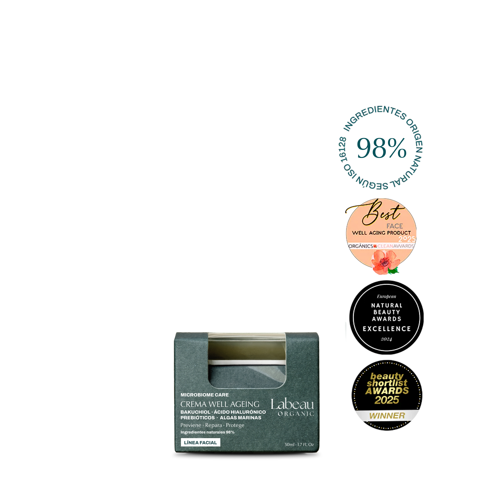 Labeau Organic's Well Aging Cream is developed from an awareness of the need to reclaim nature as a remedy. In the search for the most natural product possible, we have succeeded in formulating it with 98% natural ingredients. Thanks to the prebiotics that help to preserve the microbiota of our skin, we prevent photoaging and other alterations such as dermatitis or infections. Bakuchiol together with hyaluronic acid stimulate collagen synthesis to improve firmness, hydration and elasticity in our skin. Seaweed helps to create a protective shield against artificial lights, UV rays and inflammatory stress.